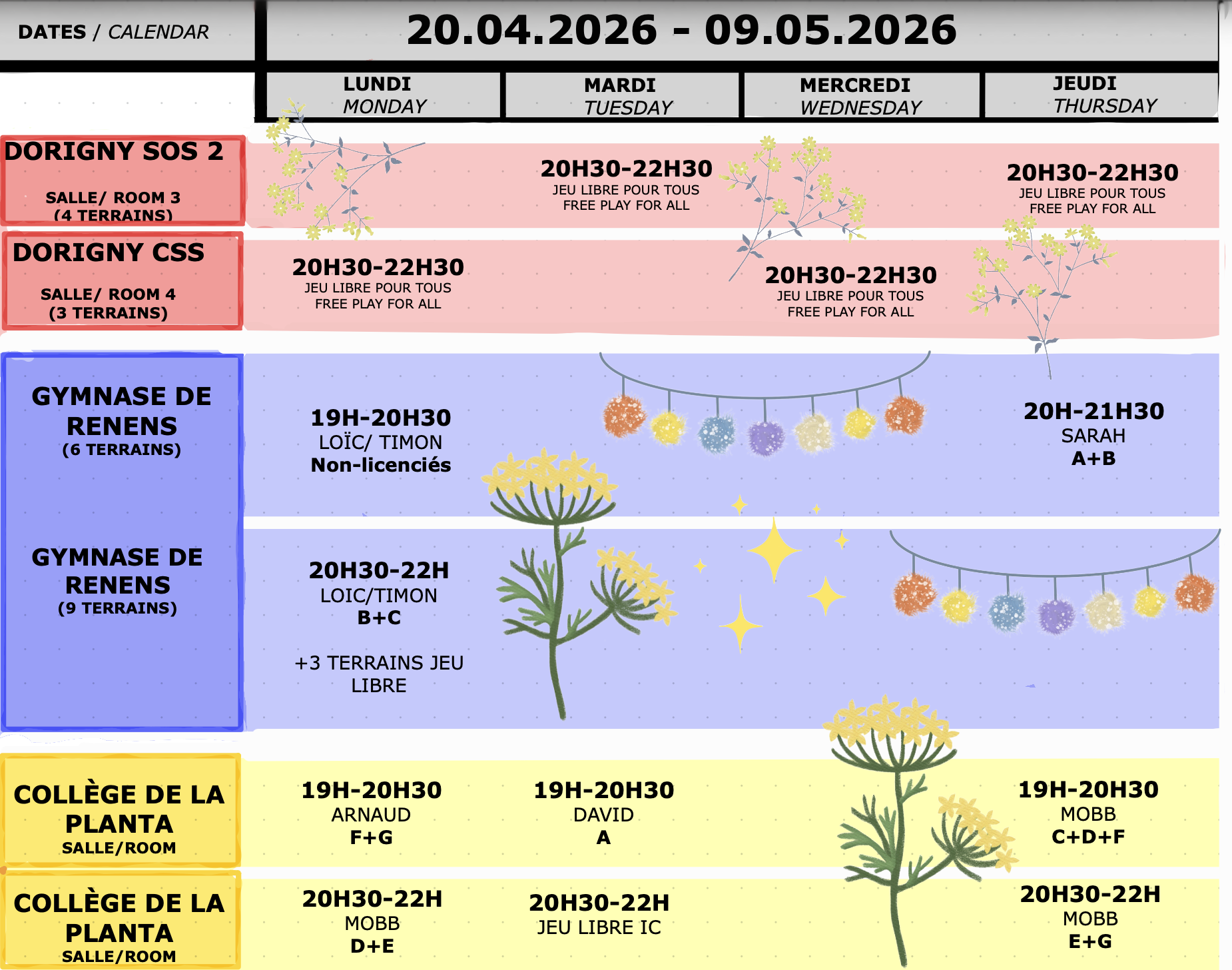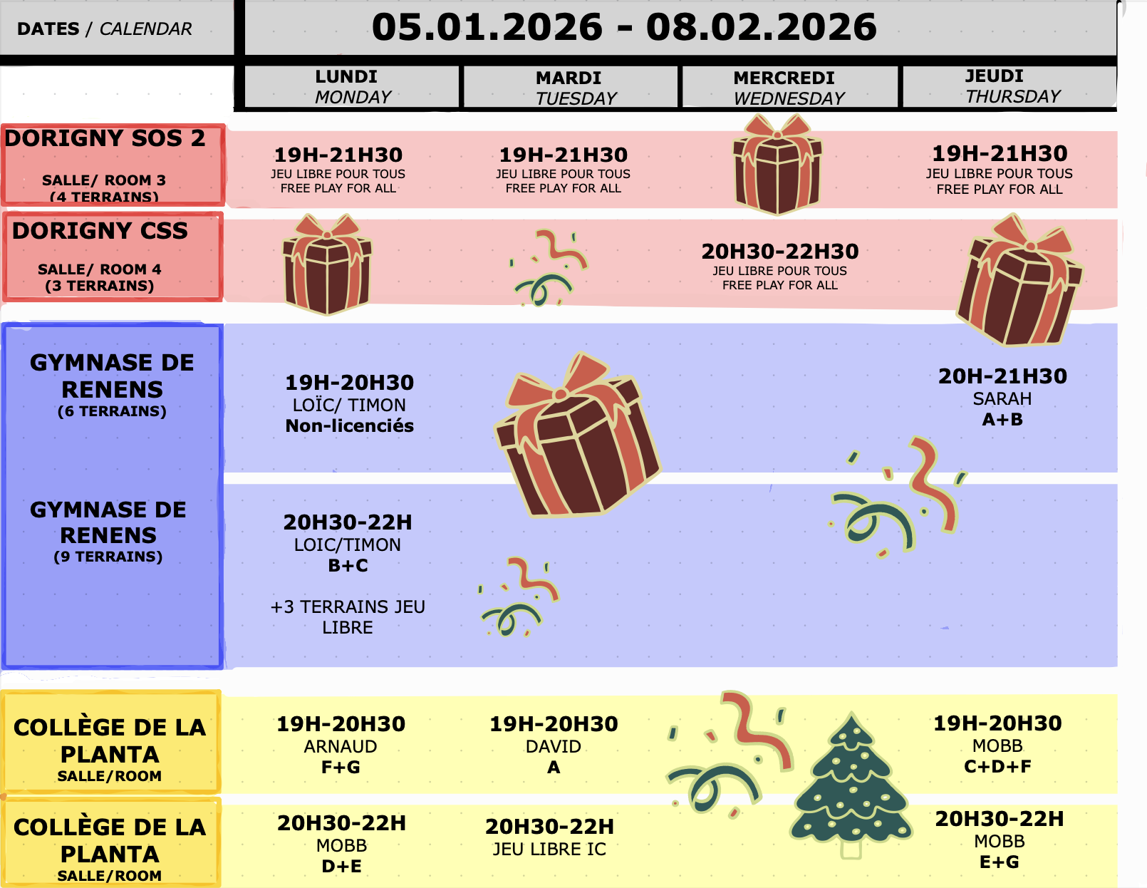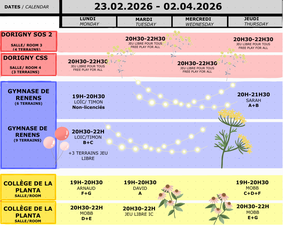 Les sessions de jeu réservées exclusivement aux membres du club sont prévues aux horaires ci-dessous :